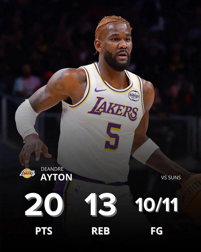 这场比赛过程很曲折,湖人第四节领先20分差点被翻盘,但艾顿交出了相当出色的表现:全场出战30分钟,投篮11中10,拿下20分13篮板2抢断1盖帽,他的单场投篮命中率高达90.9%。